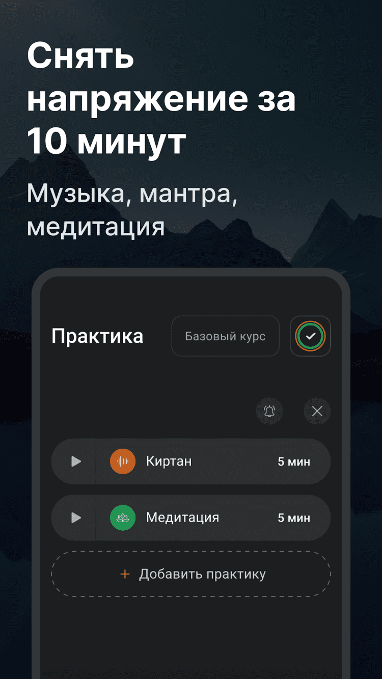 - настраиваемый таймер для медитации с мягким звуковым уведомлением об окончании практики;