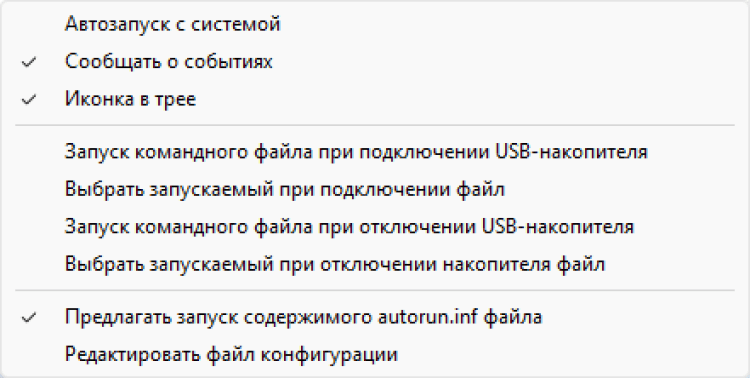 USB - это программа для ликвидации угроз распространения вирусов распространяющихся через autorun.inf файлы. Она загружается в оперативную память и при подключении новых дисков автоматически переименовывает находящиеся на них файлы autorun.inf (при их наличии) в autorun.inf_renamed, в результате чего значительно снижается вероятность заражения компьютера вирусами распространяющимися через flash-накопители.