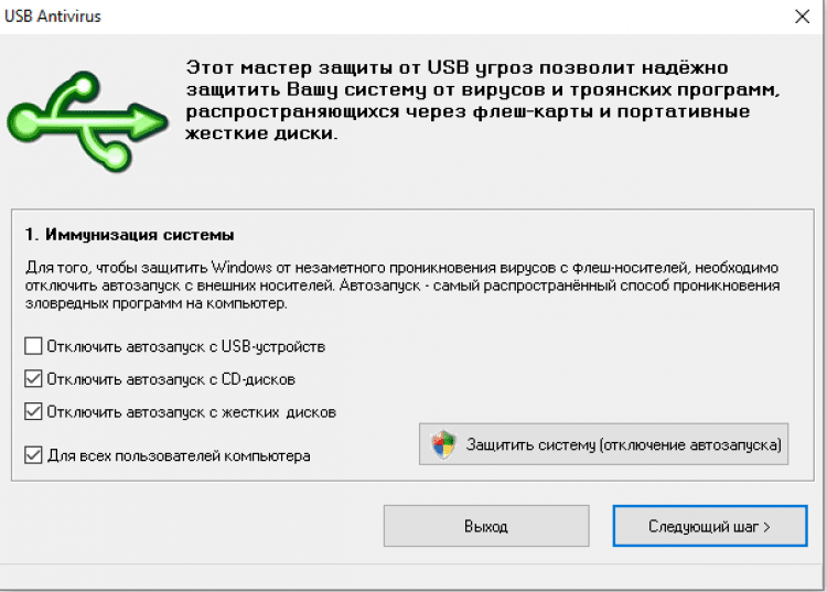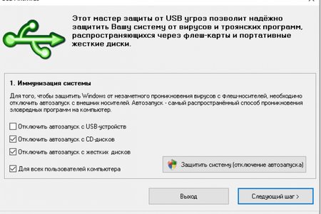 - Защита системы, после которой вы сможете подключать к своему компьютеру чужие USB-флешки, переносные жесткие диски и CD-R диски без боязни заразить систему сразу при подключении