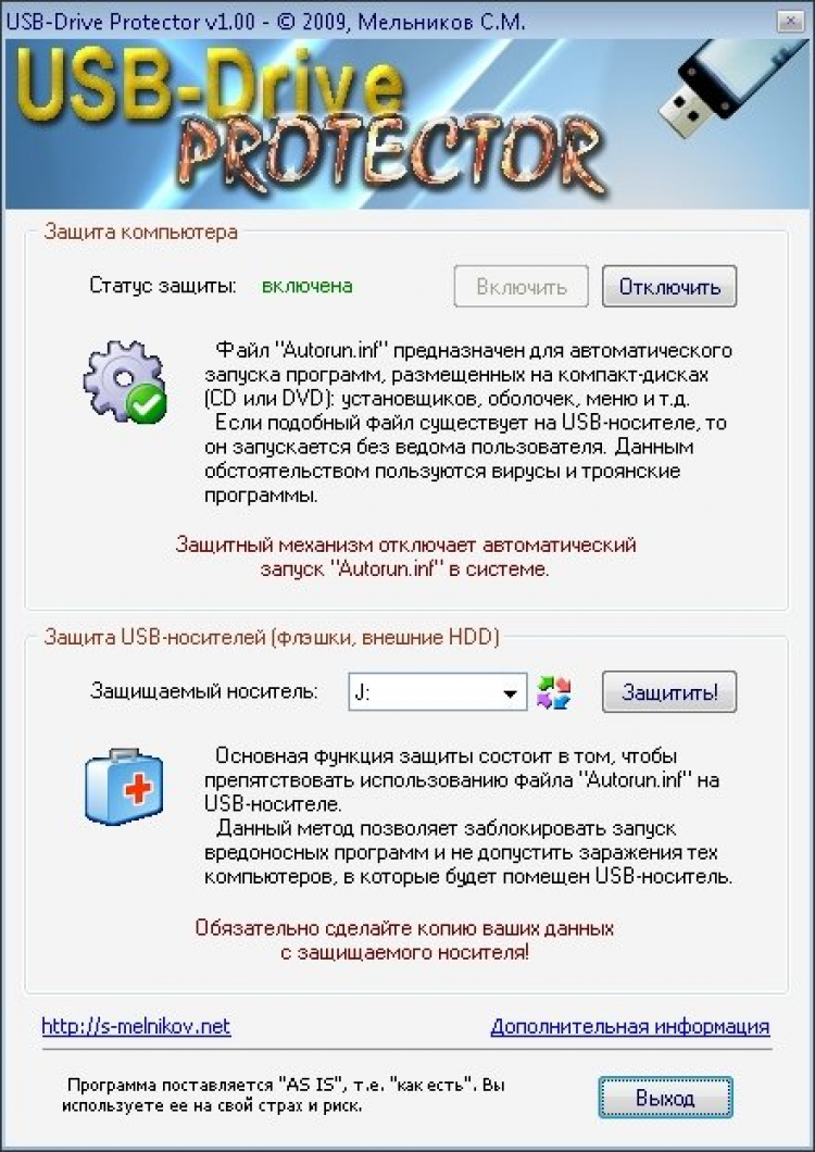 USB-Drive Protector - программа, предназначенная для вакцинации USB-носителей против вирусов и троянцев, использующих механизм автозапуска, а также для защиты компьютера от заражения через съемные носители.