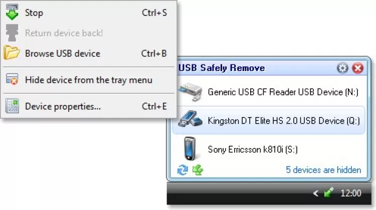 С ее помощью вы можете быстро извлекать устройства используя контекстное меню или горячие клавиши. Из контекстного меню USB Safely Remove можно скрыть устройства, которые вы не хотите извлекать. Также из этого меню можно открыть устройство или перейти к его свойствам.