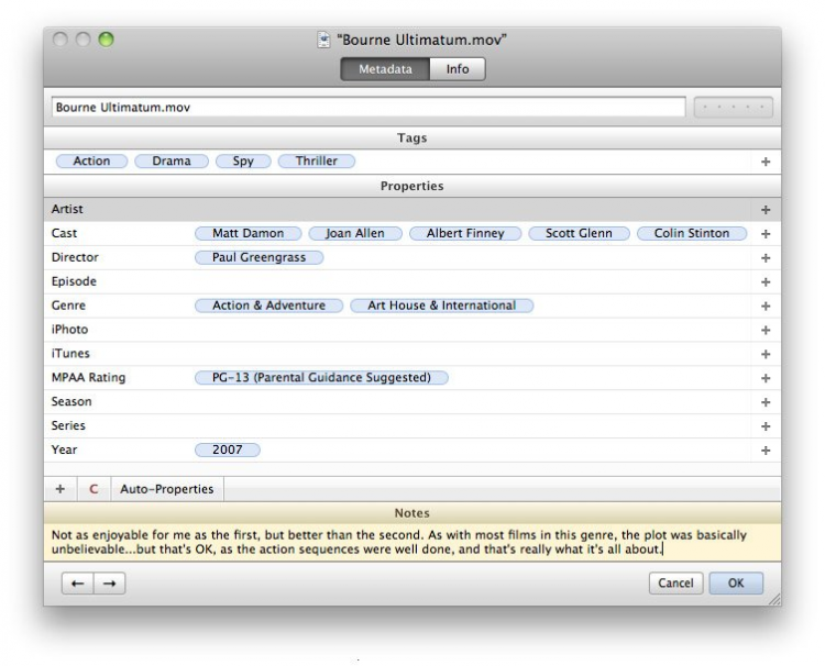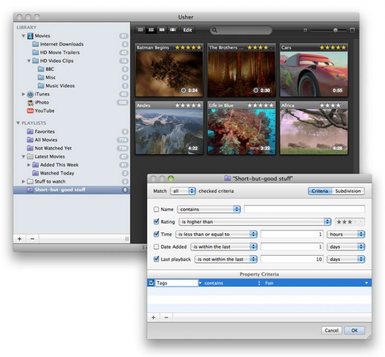 Usher Отличное средство для создания и ведения собственной фильмотеки. Usher поможет управиться с видео, которое храниться на жестких дисках и в медиатеках iTunes, iPhoto, и Aperture. Пользователи могут добавлять подробную информацию о каждом видео и использовать "умные" плейлисты для их фильтрации по этим данным.