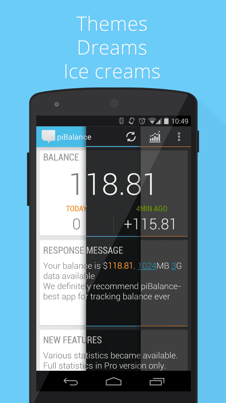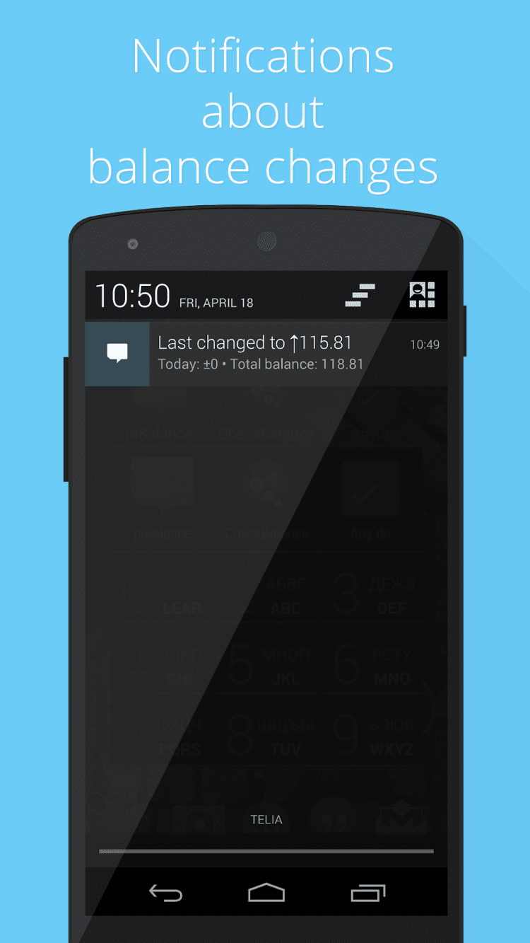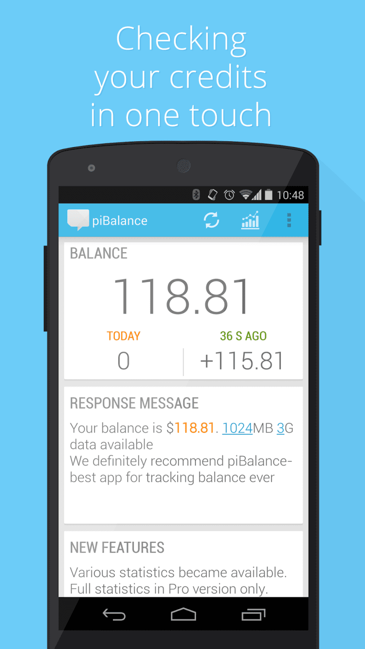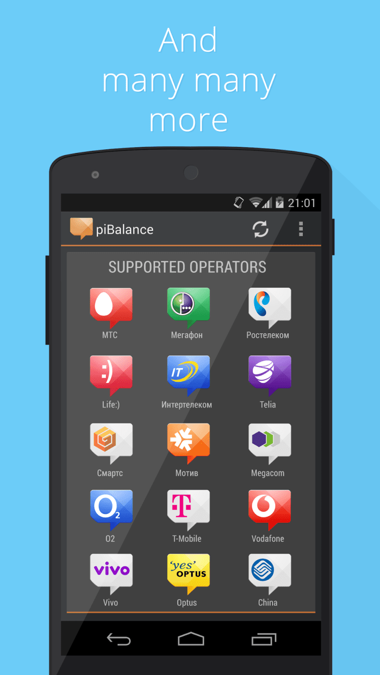 USSD piBalance–виджет баланса Симпатичный виджет, помогает всегда быть в курсе вашего баланса. Баланс запрашивается путем отправки бесплатных sms-запросов. Вместо баланса можно следить за количеством бонусов, суммой долга, лимитом интернета, sms и пр. Обновляется автоматически: - после завершения разговора - после отключения от интернета - периодически с заданной частотой Сразу и без настроек работает с операторами: