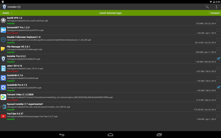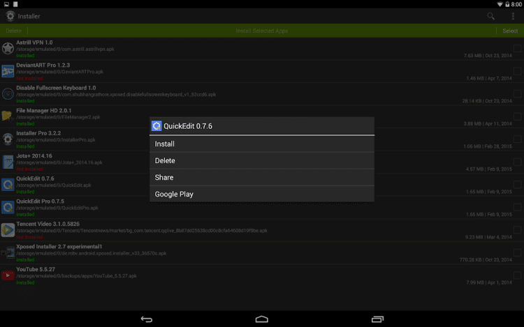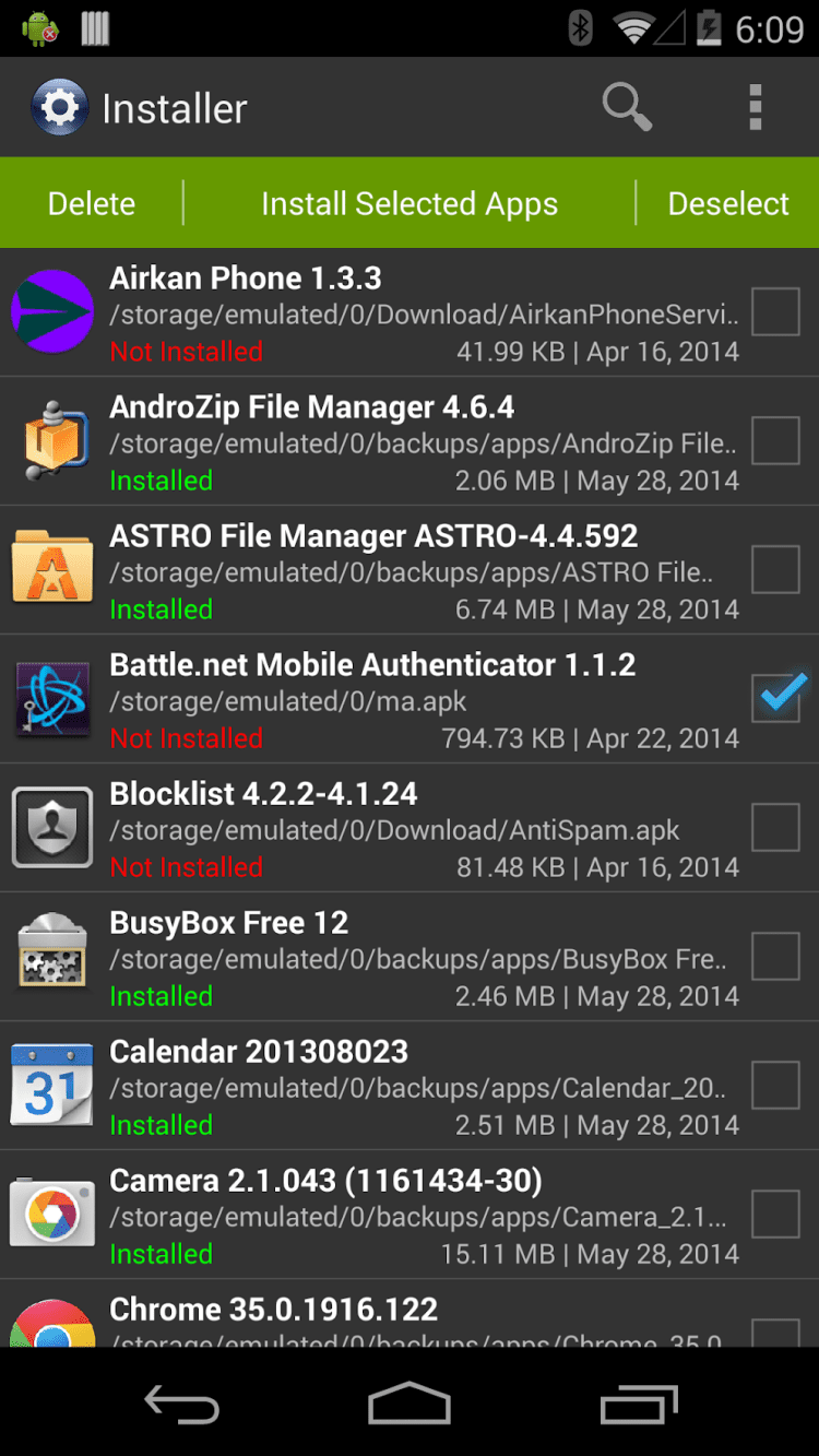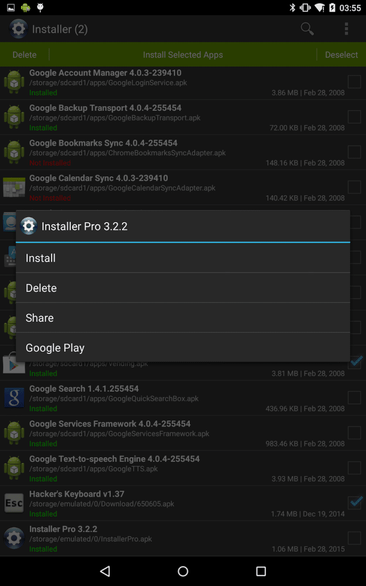 Установка (Install APK) программа для установки и удаления приложений как из Google Play, так и из установочных файлов с SD-карты. Эта программа выполнит сканирование памяти устройства и отобразит список всех установочных файлов, найденных на устройстве или SD-карты. Installer позволяет устанавливать или удалять сразу несколько программ, просматривать размер программ, дату их установки, а так же выполнять мгновенный поиск по названию программ.