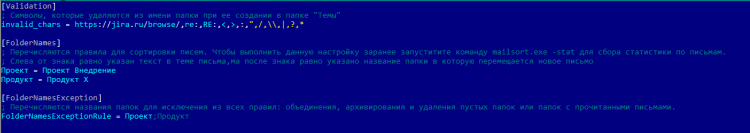 - Конфигурация: Программа использует два INI-файла для настройки: mailsort.ini для основных параметров и mailsort_rules.ini для правил сортировки