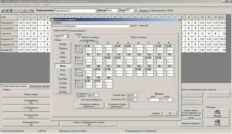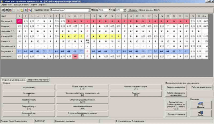 - быстрый ввод неявок различными способами, оперативный подсчет рабочего времени;