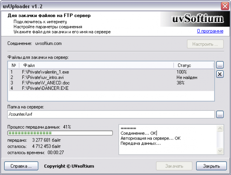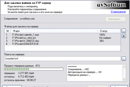 uvUploader - программа для закачки на FTP-сервер списка файлов большого размера при плохом соединении, когда очень вероятен разрыв соединения. Настраеваем FTP соединение (указываем домен, пользователя, пароль), выбираем файлы для закачки (они заносятся в очередь закачек), указываем в какую папку на сервере закачивать файлы. Нажимаем кнопку "Закачать" и наблюдаем процесс передачи данных. В случае разрыва соединения программа автоматически пробует подключится каждые 10 сек. Докачка файла возможна и после внезапного отключения питания компьютера. В этом случае при запуске будет предложено продолжить прерванную закачку.