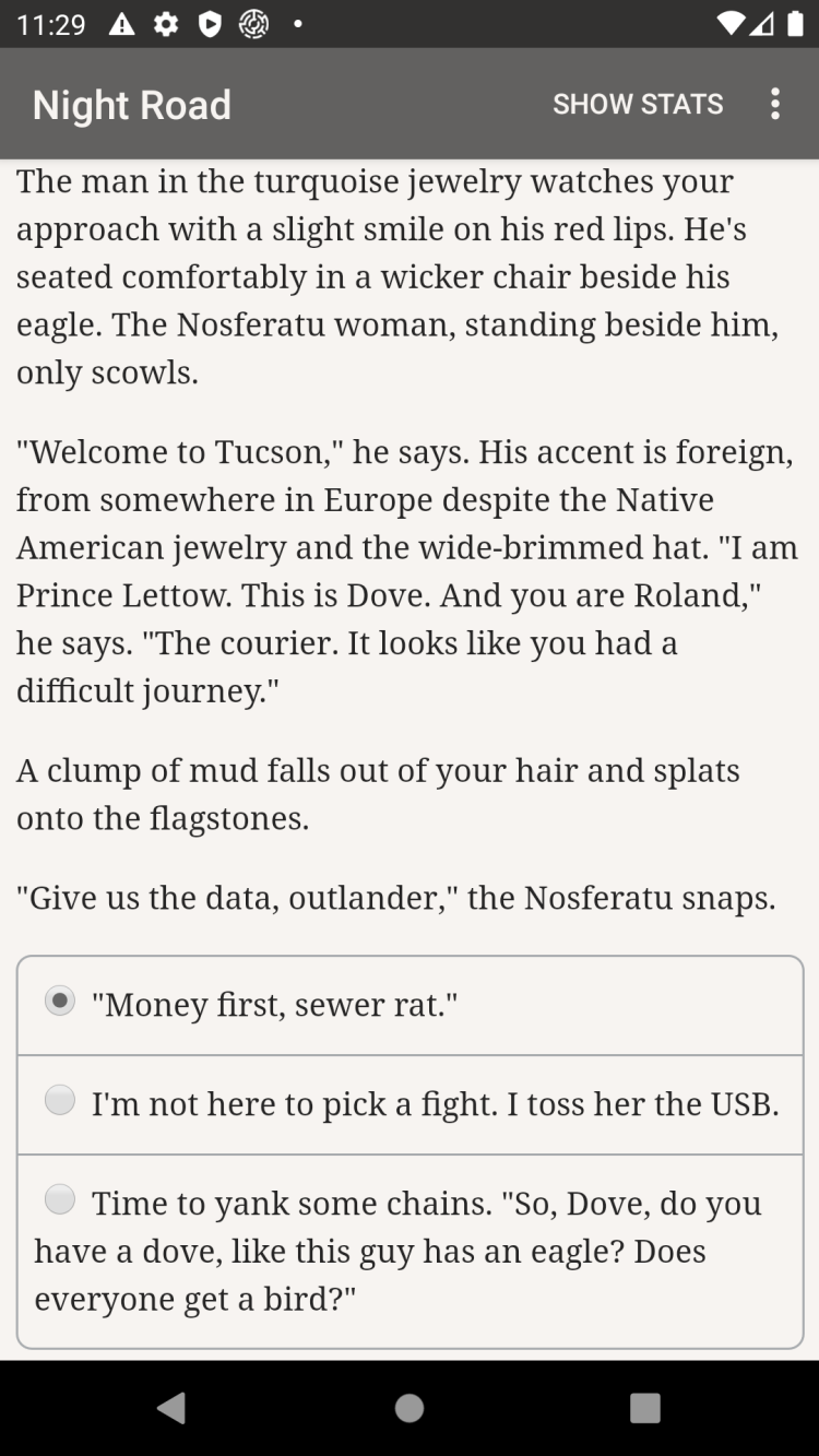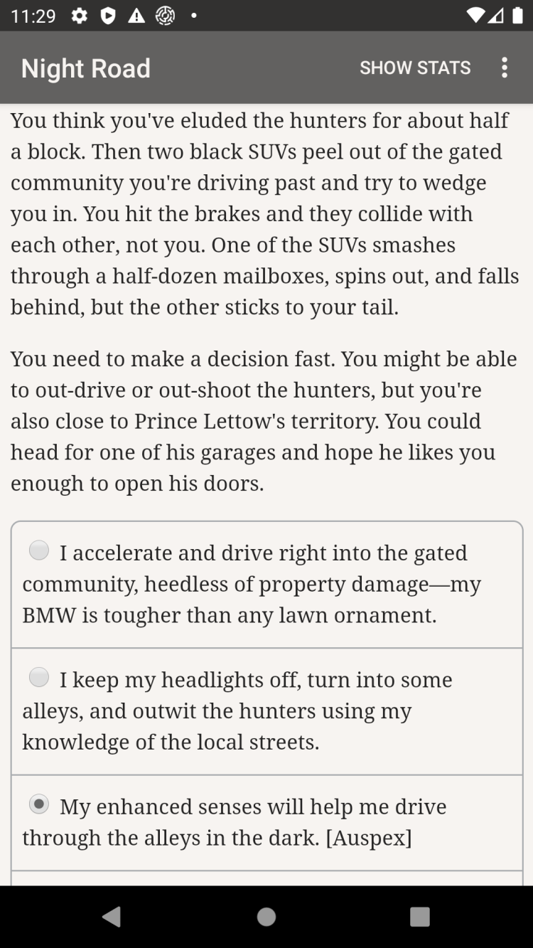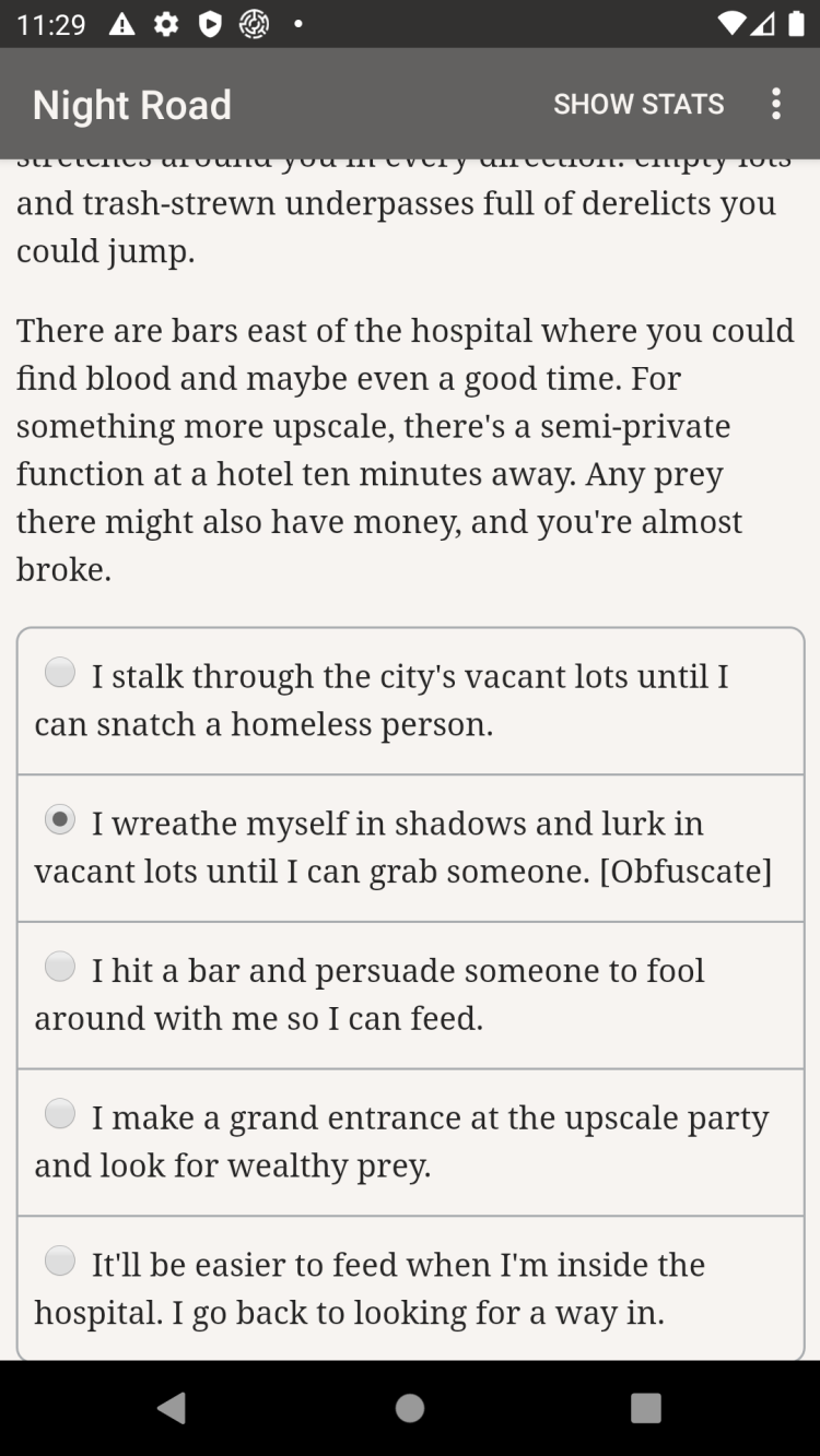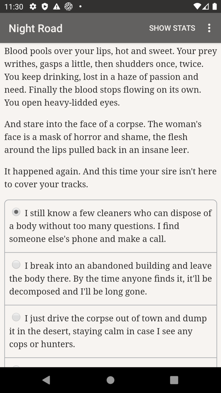 Если вам нравятся визуальные новеллы или текстовые RPG, мы рекомендуем вам бесплатно скачать Vampire — Night Road для Android с нашего сайта. Этот интерактивный хоррор-роман объемом 650.000+ слов наверняка придется по вкусу всем любителям историй о вампирах.