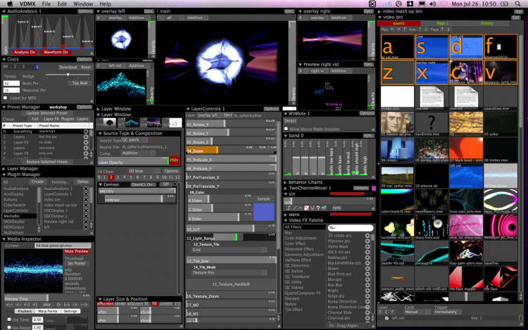 VDMX5 Программа, созданная для создания видеопредставлений. Совместима с любыми программами и оборудованием, что есть в вашем распоряжении. Программа построена таким образом, что вы можете получить завораживающие видеоэффекты в реальном времени. Совмещая и контролируя различные модули VDMX, вы можете создать собственную видео студию, адаптировать её под проведение мероприятий, пост-продакшна и тп.
