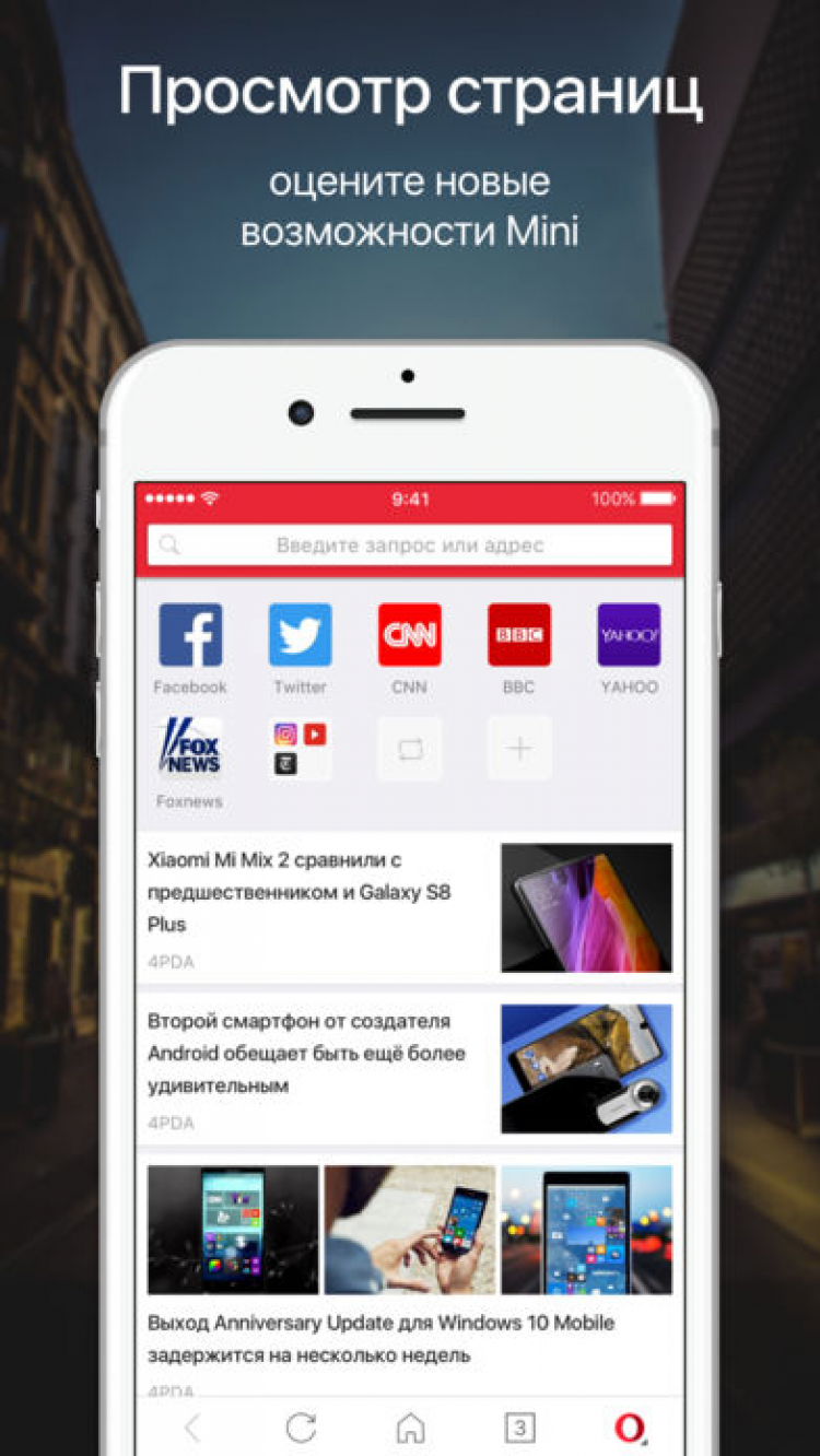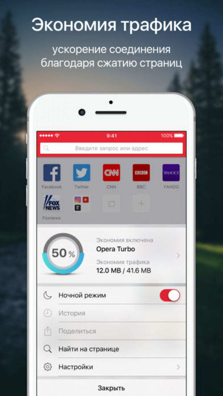 Установив Opera на свой iPhone или iPad, вы сможете полностью настроить его оформление, сделав интернет серфинг еще приятнее. Для тех, кто любит оставаться онлайн даже в темное время суток, предусмотрен специальный ночной режим, уменьшающий яркость экрана при использовании браузера и, тем самым, снижающий нагрузку на глаза.
