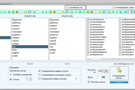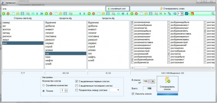 Verbarium - это программа для создания названий и неологизмов путем сбора слов из введённых слогов. Слоги разделены на три группы: начальный слог, средний слог, последний слог. Для заполнения списков используйте кнопку [+], слог скопируется из верхнего поля в список. Перемещение слогов между столбцами можно осуществить кнопками или перетаскиванием. После наполнения необходимого количества слогов, их можно сохранить отдельными файлами. Перед созданием слова укажите количество слогов в нём. Можно указать случайное количество, можно конкретное.