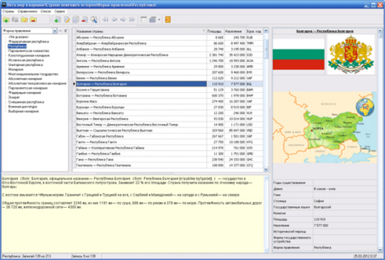 Весь мир в кармане - это программа - пополняемый электронный справочник стран. В помощь коллекционеру. Также будет интересна людям, увлекающимся географией, политической историей и социологией.