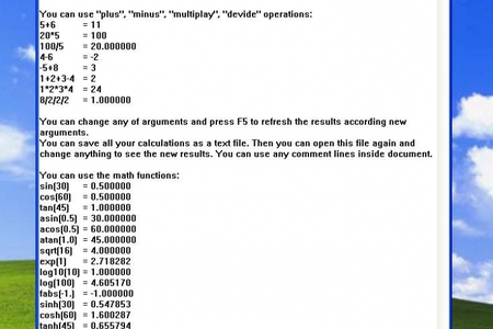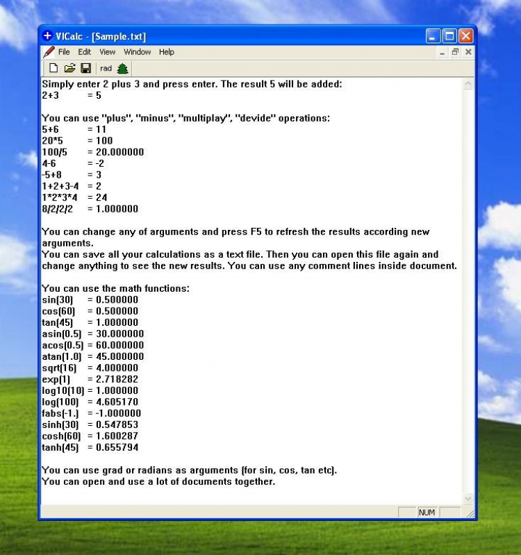 VICalc - это простой в использовании калькулятор с возможностью загрузки задач из текстового файла. Программа поддерживает простые математические операции и тригонометрические функции, а также умеет считать в радианах, градусах и градах.
