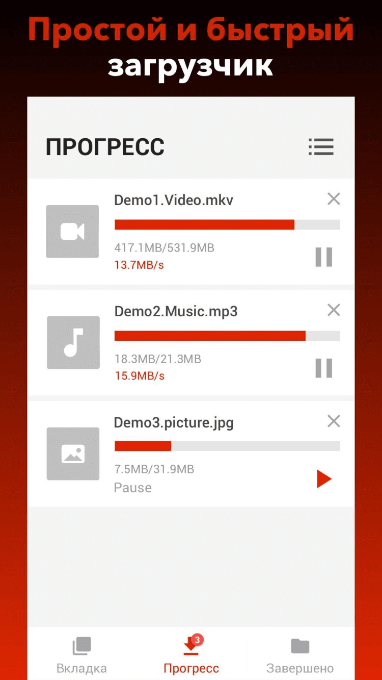 - возможность приостановить загрузку и возобновить её в любой момент;