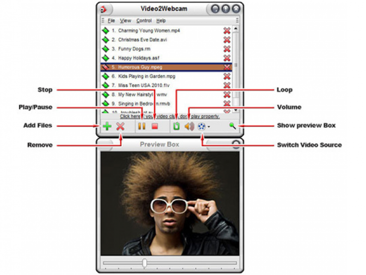 Вы можете составить целый плейлист из видео роликов, которые Video2Webcam будет прокручивать во время чата. В любой момент показ видео можно остановить или поставить на паузу. Также есть возможность регулировки громкости видео. А чтобы было проще ориентироваться в плейлисте, в программе есть окно предварительного просмотра видео.