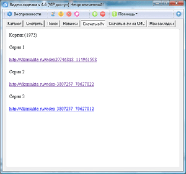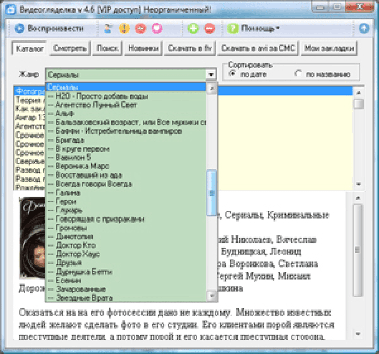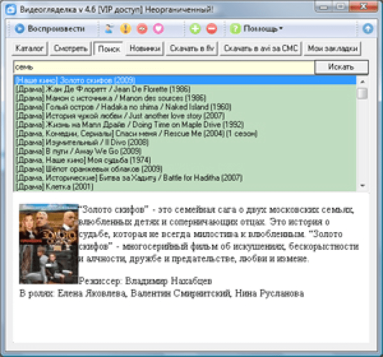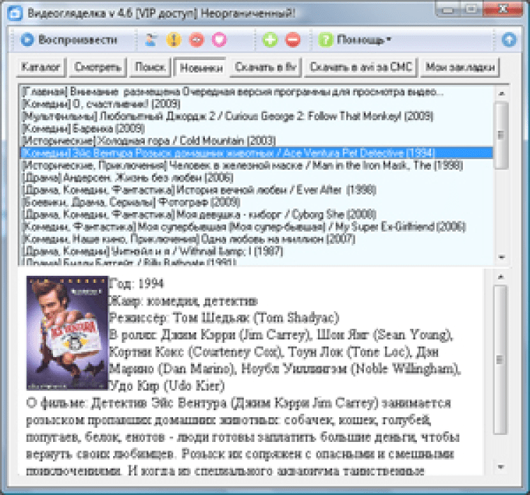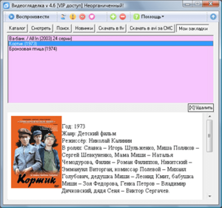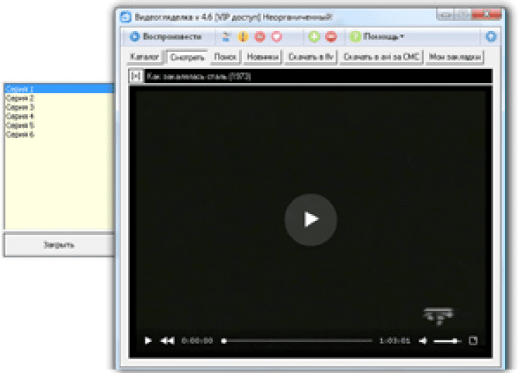 ВидеоГляделка - это программа для просмотра фильмов и сериалов в режиме онлайн. Она предоставляет пользователям доступ к огромной коллекции фильмов, мультфильмов и сериалов, которая насчитывает свыше 6500 наименований. А если в базе не нашлось желаемого фильма, то его можно заказать. Понравившиеся фильмы можно скачивать на компьютер. Так же в программе присутствует чат, в котором можно обсуждать фильмы и сериалы с другими пользователями.