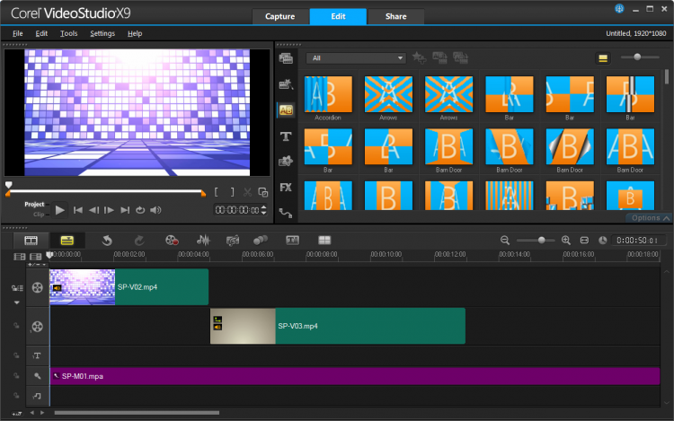 Между видео клипами и изображениями можно вставлять эффекты перехода, например плавное затухание, растворение и пр. Также VideoStudio Pro позволяет вставлять музыку и другие звуки, а с помощью таймлайна настраивать их позицию синхронизируя их с видео.