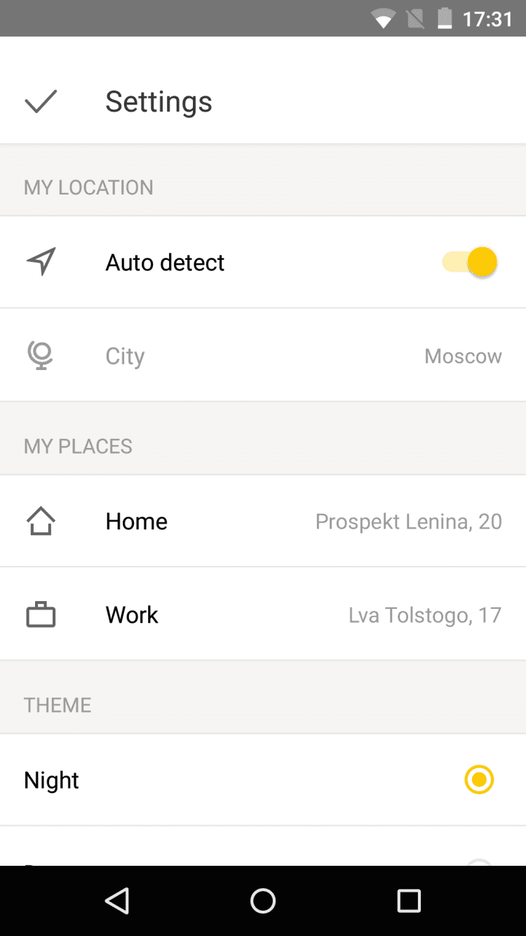 В настройках можно выбрать город, указать время обновления и точки, между которыми будет анализироваться дорожная ситуация (бета-версия).