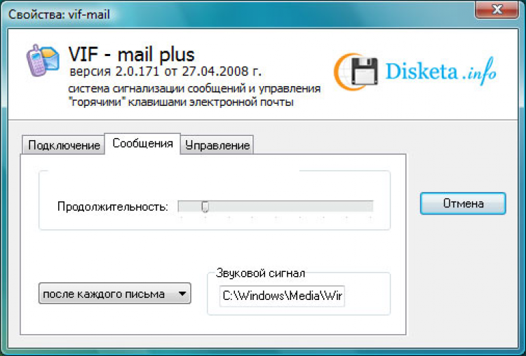 VIF-mail - это небольшая утилита, работающая в фоновом режиме для сигнализации о поступление новых сообщений на электронный почтовый ящик. Гибкая настройка «горячих» клавиш для вызова почтовой программы и создания в ней нового сообщения. Программа информирует о поступлении почты: звуковым сигналом, сообщением в системной области около часов, а так же возможен вариант индикации - мигание лампочек клавиатуры.