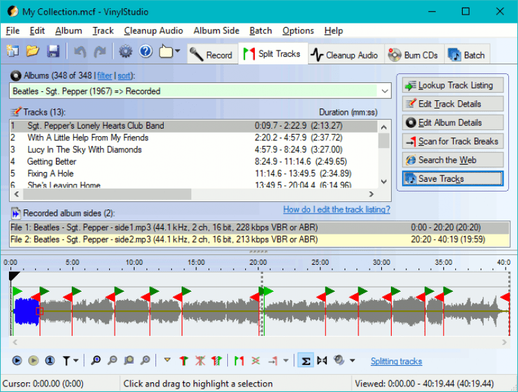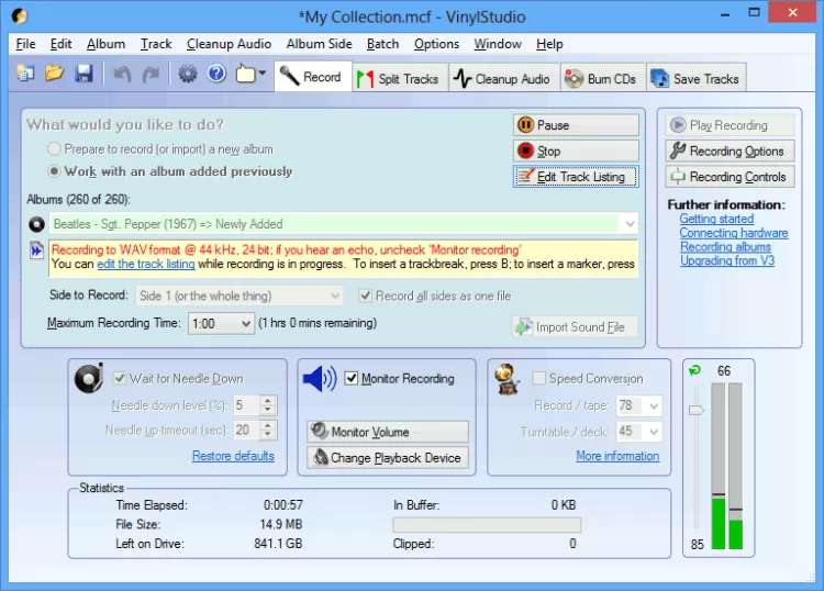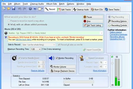 Главное окно VinylStudio разделено на вкладки и позволяет записывать и разделять треки, чистить треки, записывать CD и DVD диски, сохранять треки на жесткий диск. Плюс в нем встроенный музыкальный проигрыватель. Функция записи весьма продвинутая, может записывать аудио в WAV, AIFF, FLAC, MP3 и OGG форматы. Настроить качество записи можно вручную.