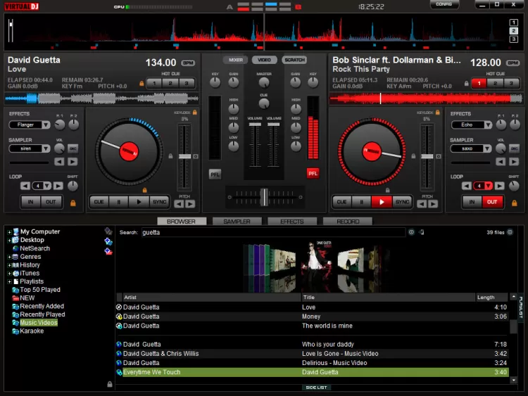 Интерфейс VirtualDJ выполнен в виде диджейского пульта с двумя деками. Программой можно пользоваться с или без внешних контроллеров.