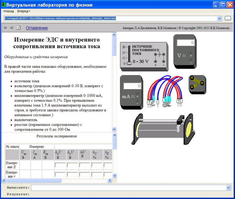 Виртуальная лаборатория по физике для школьников - это программа содержит набор программ по школьному курсу физики и предназначена для использования учителями на уроках физики, а также учащимися для выполнения заданий с использованием компьютеров на уроках и дома. Может быть использована при подготовке к ЕГЭ и интернет-олимпиаде школьников по физике.