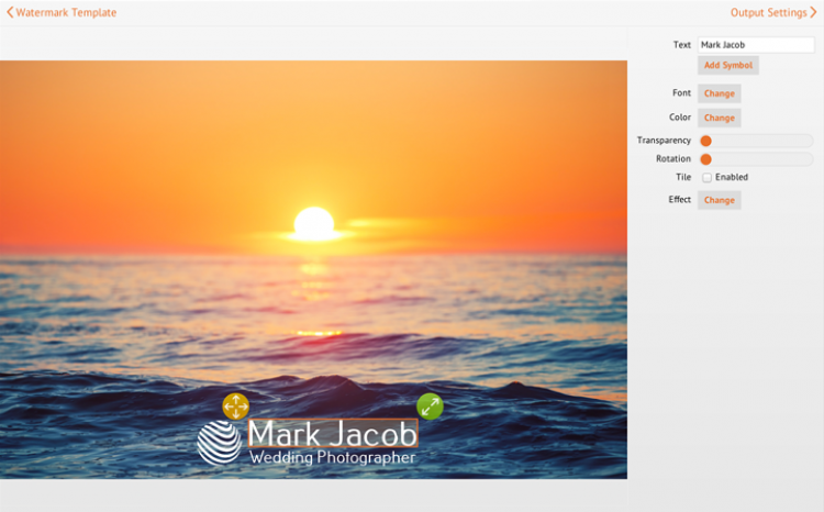 Visual Watermark предоставляет на выбор 12 готовых шаблонов водяного знака и гибкие настройки. Они позволяет изменить положение водяного знака, его размер, прозрачность и другие параметры, применять эффекты, добавлять тень и фон. Можно настраивать отдельные элементы водяного знака. Visual Watermark также позволяет вносить свои контактные и другие данные в мета-теги изображений. Кроме этого, в программе есть функции изменения разрешения изображения и переименования изображений. Программа Visual Watermark очень проста в использовании, она обладает интуитивным интерфейсом и подробными подсказками.