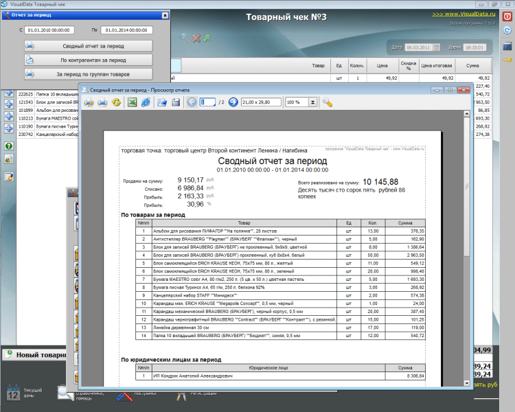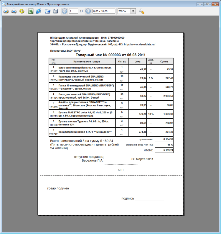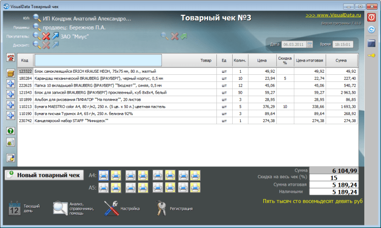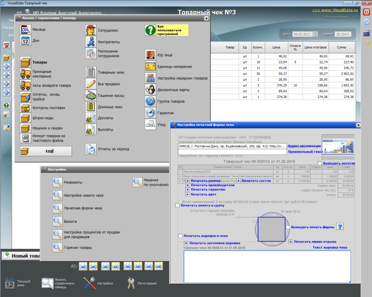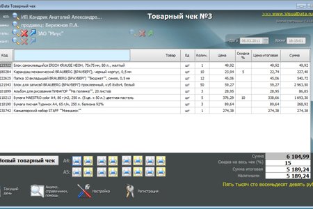 VisualData Товарный чек - это простая программа для оформления и печати товарных чеков. Программа хранит всю историю продаж, позволяет выполнить анализ по продавцам и товарам. Распечатанные чеки защищены от изменений продавцами.