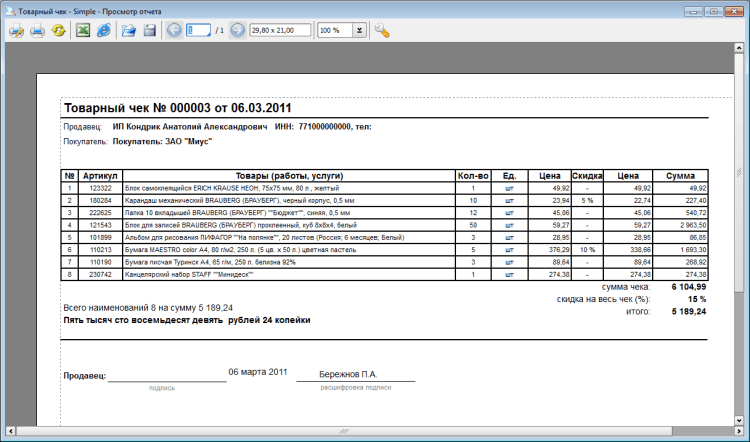 - Заполнение товарных чеков