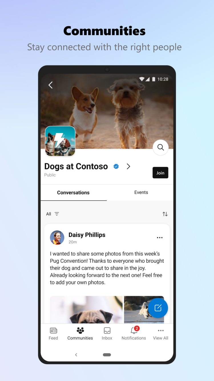 Viva Engage — это мобильное приложение, которое помогает делиться новостями и опытом с коллегами и с комфортом обсуждать совместные проекты онлайн. Программа работает как традиционные социальные сети. Создайте учетную запись, используя свой рабочий адрес электронной почты, чтобы иметь возможность присоединяться к сообществам по интересам и общаться с коллегами. Однако вместо групп, посвященных котикам, музыке или другому развлекательному контенту, здесь вы найдете корпоративные сообщества, объединяющие сотрудников вашей организации. Здесь каждый может делиться своими мыслями и участвовать в обсуждениях проектов, тренингах и т. д. Таким образом, Viva Engage помогает обмениваться опытом и координировать действия при совместной работе над проектами, даже находясь в разных частях света.