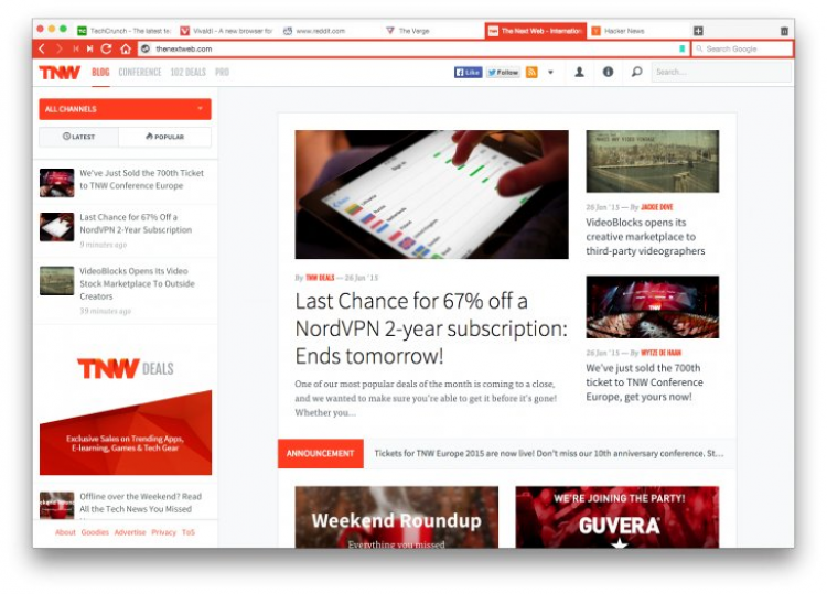 Само собой браузер поддерживает вкладки. Он позволяет группировать их по темам, раскрывать панель вкладок для обзора миниатюрных эскизов веб-страниц, и может сохранить и восстановить сессию для дальнейшей работы. Многим пользователям возможно понравится функция управления браузером с помощью жестов мышью. В добавок можно использовать комбинации клавиш для выполнения различных действий.