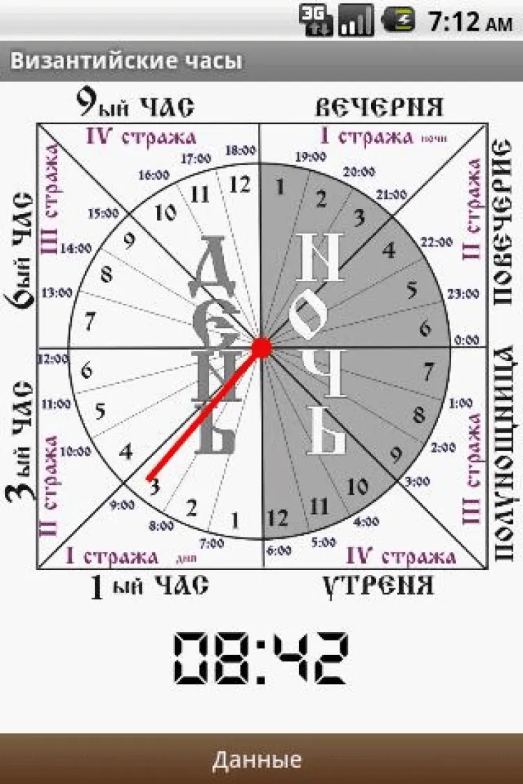 Византийские часы Программа позволяет определять текущее византийское время в выбранной точке земного шара. Византийское время, использовавшееся в древней Византийской империи, является солнечным временем. Сутки начинаются с ночной части суток одновременно с заходом солнца. После восхода солнца начинается дневная часть суток. Таким образом, продолжительность дня и ночи разная (кроме двух дней в году). Также вполне естественно, что солнечное время в разных точках земного шара будет различаться. По византийскому времени все еще живет большинство монастырей горы Афон. Соответствующие часы позволяют определять начало служб суточного богослужебного круга.Разработанное приложение позволяет всегда иметь переносные "византийские часы" везде, куда бы вы ни пошли. В приложении предусмотрена возможность хранить несколько различных местоположений и быстро переключаться между ними. Также в программе присутствуют два виджета разного размера, которые можно разместить на главном экране устройства.