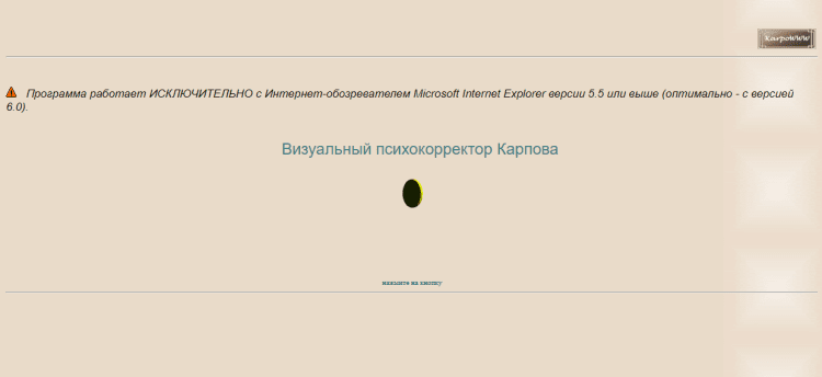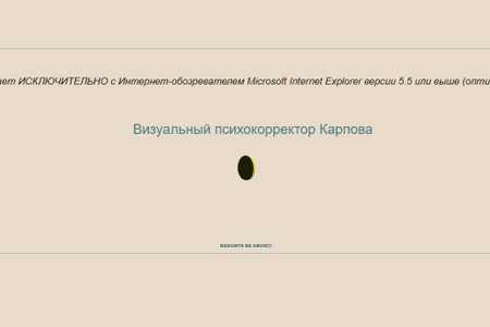 Визуальный психокорректор Карпова ВПК - это программа проведения психотерапевтических сеансов методом комплексной проработки визуальных образов. Имеется возможность сопутствующего неявного суггестивного воздействия посредством так называемого "эффекта 25-го кадра". Возможно использование off-line и on-line. Для корректной работы программы необходим Internet Explorer версии 6.0. Профессиональная версия программы - на сайте автора (прямых ссылок на эту версию не предусмотрено).