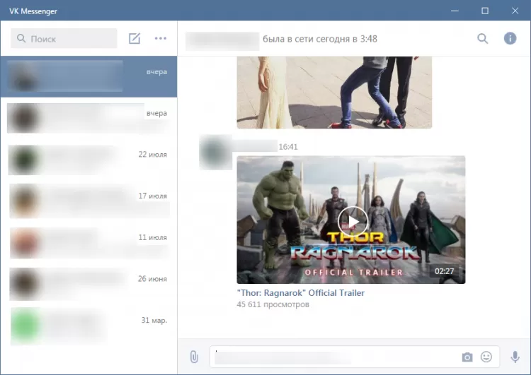 Само собой, для использования мессенджера необходимо иметь учетную запись ВКонтакте. После входа в учетку мессенджер покажет все диалоги пользователя с друзьями. Мессенджер имеет привычный вид: слева - список диалогов, справа - сами сообщения.
