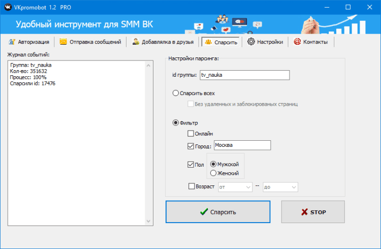 - спарсить вашу целевую аудиторию (с настраиваемым фильтром);