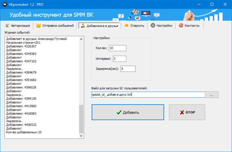 - добавлять в друзья (пользователей из файла также с пометкой маркера останова);