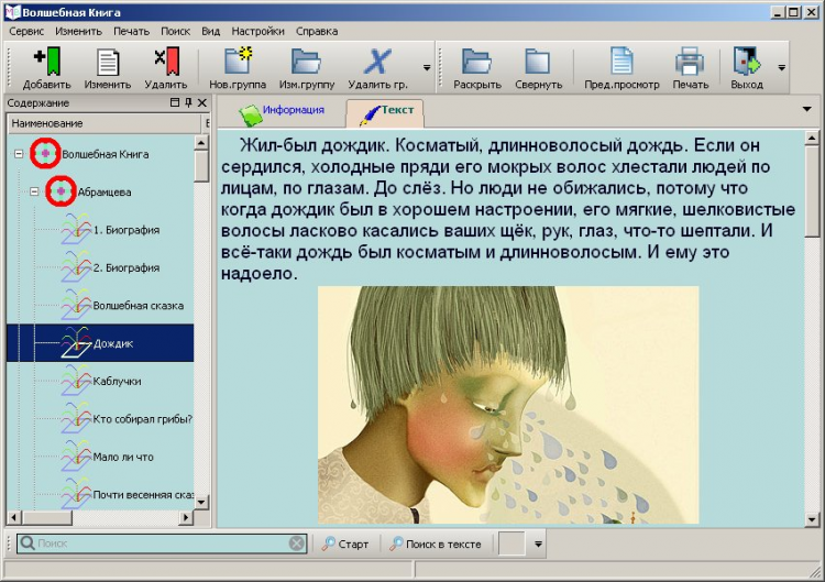 Волшебная книга - это сборник сказок, стихов, мифов и легенд для детей разного возраста. В программе предусмотрена возможность печати, поиск по названиям и полнотекстовый поиск внутри произведений. Все произведения представлены в виде дерева авторов в алфавитном порядке. Многие произведения имеют иллюстрации. Несколько произведений имеют звуковое воспроизведение. Некоторые произведения с мини-анимацией. Программа не требует установки, адаптирована для работы с CD или flash usb.