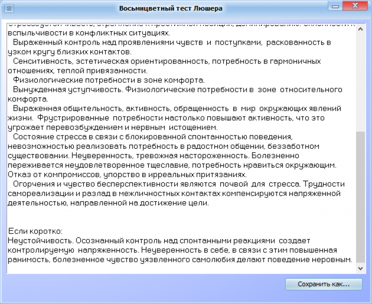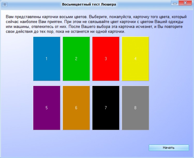 Восьмицветный тест Люшера - это предлагается программа для Windows которая позволяет измерить психофизиологическое состояние человека, его стрессоустойчивость, активность и коммуникативные способности. Тест Люшера позволяет определить причины психологического стресса, который может привести к появлению физиологических симптомов. Тест Люшера - это цветовая диагностика состояний человека. Все результаты исследований сохраняются на компьютере, их можно просмотреть в любой момент.