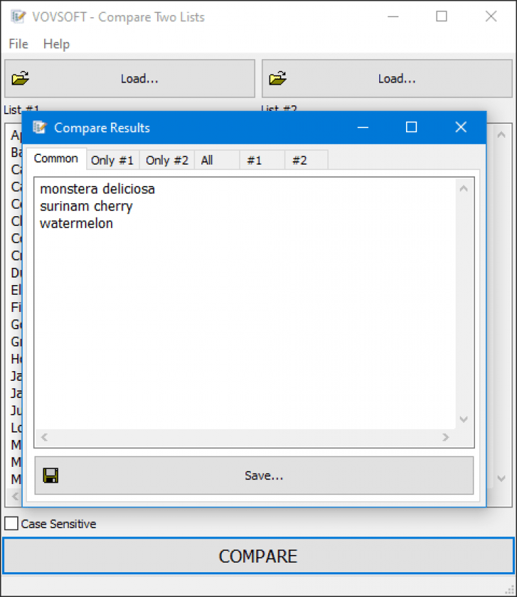 Загрузите списки из текстовых файлов или просто скопируйте их в программу и нажмите "Compare". Она проанализирует их, и покажет, что в них общего. С ее помощью можно, например, сравнить несколько разных колонок таблицы Excel, не внося никаких изменений в саму таблицу. Программа поддерживает логические операторы AND и OR, а так же выполняет сравнение с учетом/без учета регистра букв.