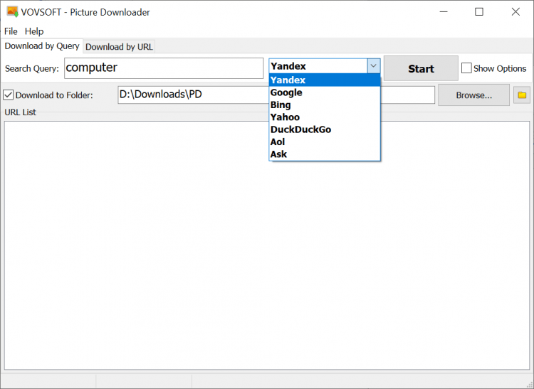 Программа предлагает две вкладки. На первой можно выполнить поиск картинок по ключевому слову в поисковике и скачать все, что будет в поисковой выдаче. Доступен поиск в Google, Яндекс, Bing, Yahoo, DuckDuckGo, AOL и Ask.