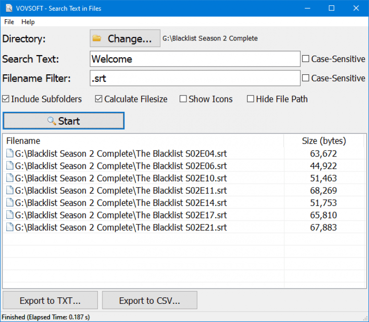 Vovsoft Search Text in Files — это простая утилита для поиска файлов. Ищет нужное с помощью простых запросов, выводит список подходящих файлов, позволяя экспортировать его в TXT или CSV.