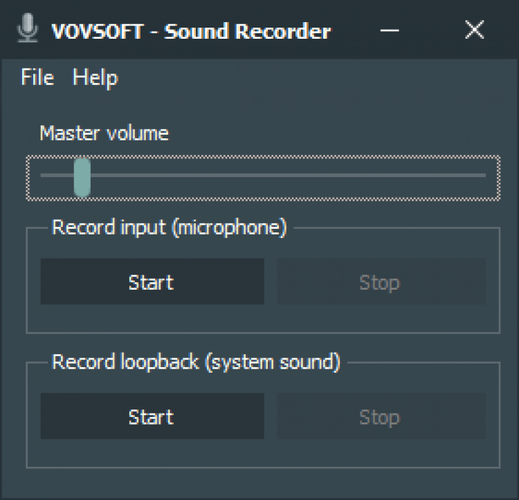Интерфейс Vovsoft Sound Recorder состоит из одного ползунка громкости и отдельных кнопок для начала/остановки записи звука с микрофона или системы. Аудиозаписи сохраняются в формате WAV.