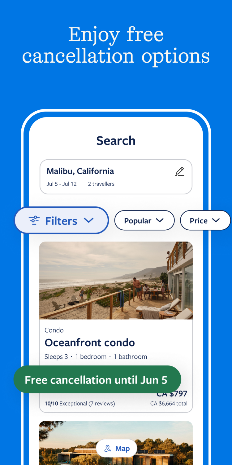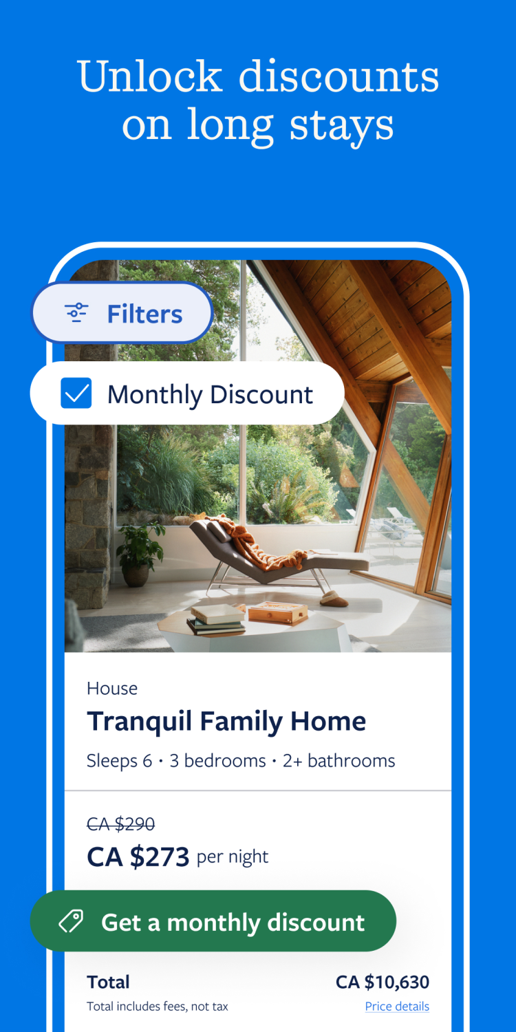 Одним из важнейших преимуществ приложения является доступ к различным скидкам. Например, Vrbo предлагает лучшие цены для тех, кто ищет место для длительного проживания. Подарите себе отпуск мечты, забронировав идеальное место по самой доступной цене. А чтобы улучшить свои впечатления от путешествия, воспользуйтесь подборкой советов экспертов и путеводителями, тщательно отобранными для вас в этой программе.