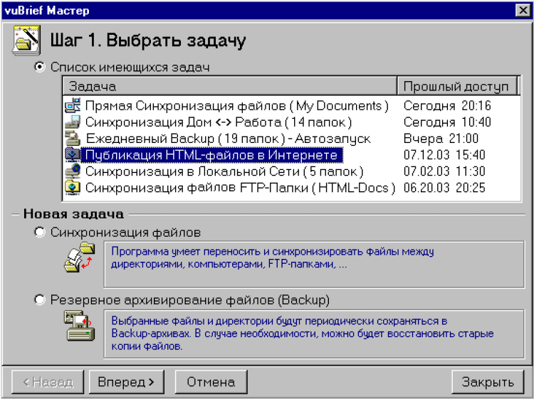 vuBrief - это перенос и синхронизация файлов между компьютерами, ноутбуками, Web/FTP-папками + резервное копирование файлов (Backup). Синхронизировать файлы можно: между двумя директориями, или между двумя компьютерами по сети, или даже между рабочим и домашним компьютерами (не соединенных сетью).