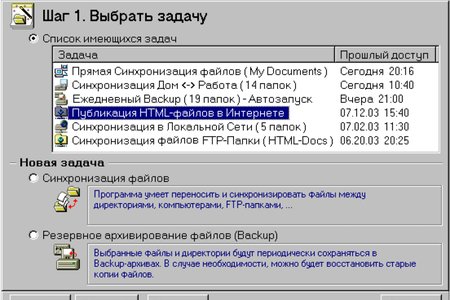 Программа умеет синхронизировать файлы между локальными папками и папками на FTP серверах. Это удобно для пользователей которые постоянно публикуют / обновляют свои HTML-страницы и другие файлы в Интернете. Причем синхронизация/обмен файлами может проходить в обе стороны. Данные между компьютерами переносятся напрямую через Локальную Сеть. Но если прямой связи нет, то данные между удаленными компьютерами можно синхронизировать в два этапа, через устройство-посредник: - через Floppy-Disk; - через FTP-сервер; - через Съемный Носитель(CDRW, HDD, Iomega ZIP, Flash Disk).