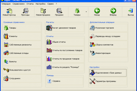 Поддерживаются все основные операции: оптовые и розничные приход и расход товаров, переводы между складами, сборка на склад и под заказ, инвентаризации.
