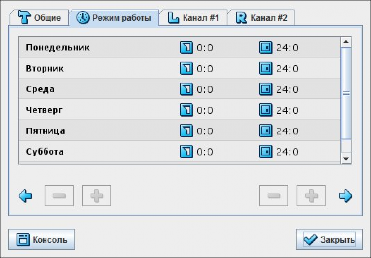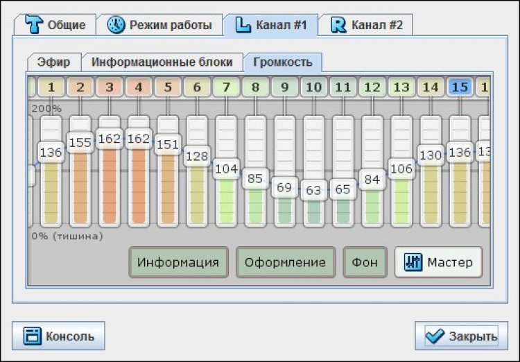 Один ПК, с установленной копией системы, может транслировать совершенно 2 разных эфира на левый и правый каналы, а также можно управлять громкостью для разных каналов независимо. - Регулятор громкости на 24 часа