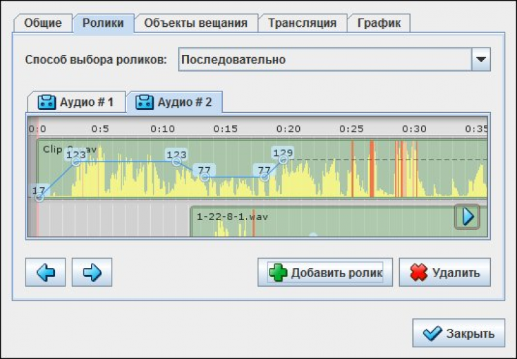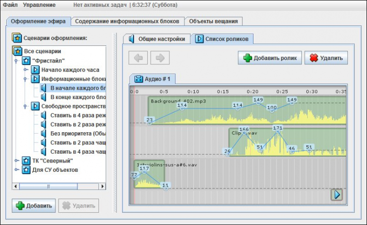 В системе можно выставить, как бесконечное вещание ролика, так и создать определённый график выходов. В графике можно указать число, час и количество выходов ролика для этого часа. - Встроенный аудиосеквенсор (аудиоредактор)