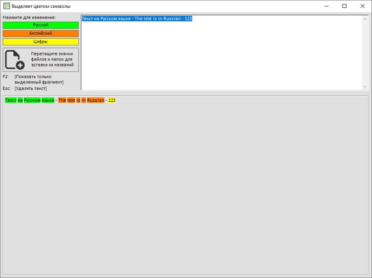 Программа выделяет разными цветами буквы русского и английского языка, цифры.