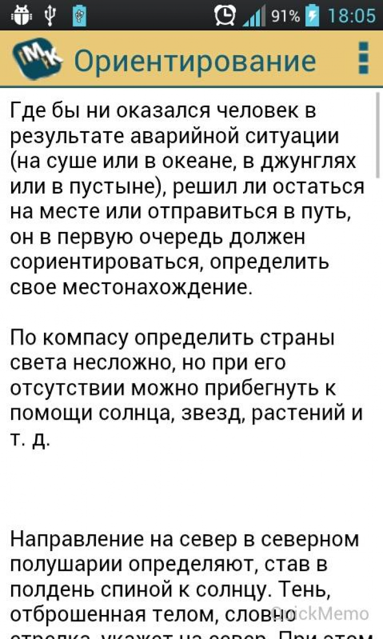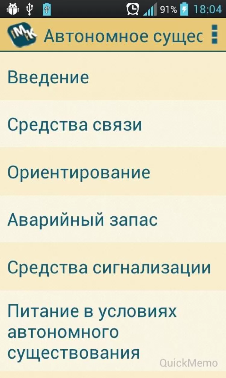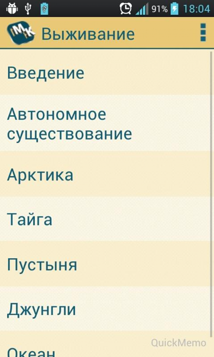 Выживание Этот справочник посвящен выживанию человека в экстремальных условиях природы. Здесь описываются приёмы и способы выживания в различных природных условиях, реальные истории людей, побывавших в экстремальных ситуациях. Лечение и профилактика от разных напастей. Как добыть пищу. Как заготовить и найти воду в условиях автономного существования. простейших вещей, таких, как развести костёр и построить укрытие от дождя или жары. Обучение таким вещам как ориентирование, питание в тайге, пустыне, океане, джунглях, а так же оказанию медицинской помощи. Просто много интересного и полезного для людей интересующихся природой, туризмом или просто любознательных граждан.